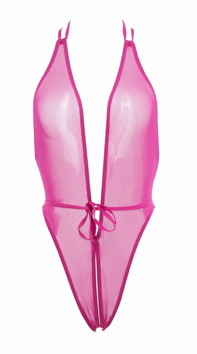 Put on a sultry show in this provocative mesh teddy featuring double halter straps, a sheer bodice, a plunging V-neckline, an open back with a tie closure, a high cut leg, an open crotch, and an open back with booty framing straps. (Pasties and panty not included.)