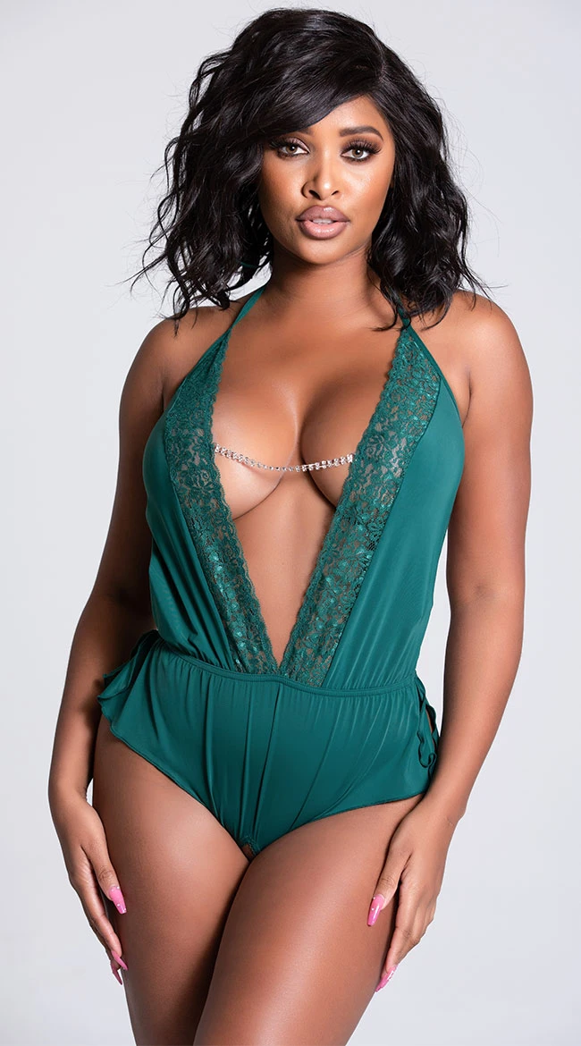Tell your babe his pleasure is your priority in this ultra sexy lingerie romper featuring a plunging V-neckline with a lace trim and silver link chain detail, halter ties, an elastic mid waistband, mini flutter shorts with vented sides, a low open back with a strappy back panel, an open crotch, and a cheeky cut back.