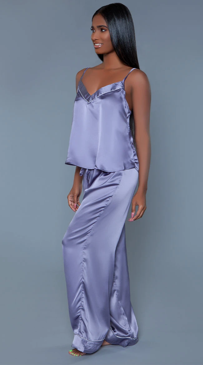 Slip into a relaxed state of mind in this satin pajama set featuring a loose cami top with a V-neckline, a silver piped trim, adjustable spaghetti straps, and matching loose pants with a drawstring tie waistband. Machine wash with similar colors. Do not bleach. Dry flat. Do not dry clean.