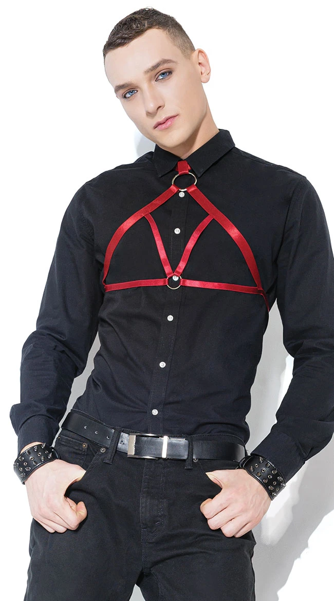 Take your teasing to another level in this ultra sexy harness set featuring an open cup bra with metal O-ring accents, halter straps, and a matching open crotch strappy harness bottom with adjustable garter straps, removable clip handcuffs, and an open back with booty framing straps. Option to wear this set over clothing. (Pasties, panty and stockings not included.)