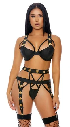 Strap into sexy in this stunning bra set featuring molded underwire cups with strappy bust detailing, thick shoulder straps with gold grommets, a matching garter belt with garter straps, and a matching high waisted caged thong. (Stockings not included.)