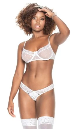 Entrance your sweetheart in this stunning lace teddy featuring sheer underwire cups with a scalloped trim, adjustable spaghetti straps, a sheer bodice, an attached garter belt overlay, adjustable garter straps, and a thong cut back. (Stockings not included.)