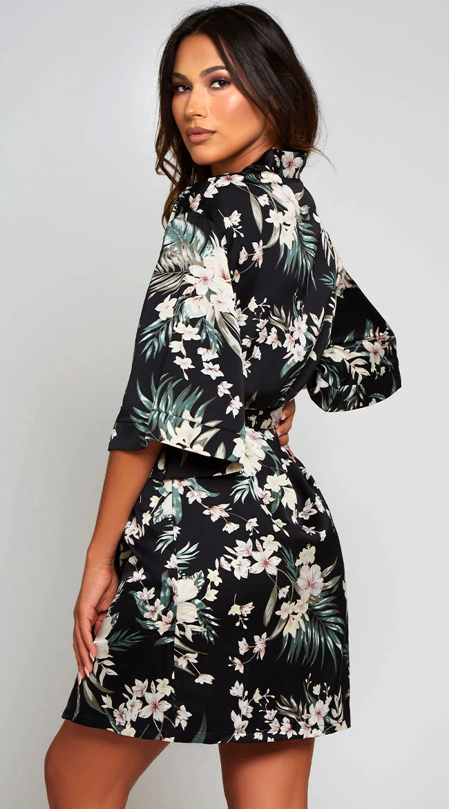 Cultivate a new self-care regimen in this sensational satin robe featuring an all over vibrant floral print, an open front, 3/4 kimono sleeves, and a matching satin waist belt.