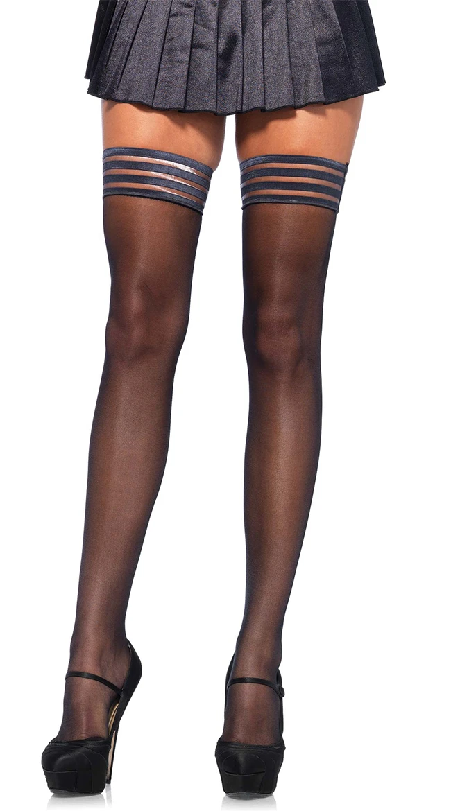 Show off your legs in these sexy stockings featuring striped tops, a sheer spandex fabric with silicone stay ups, and an over the toe style. (Shorts not included.)
