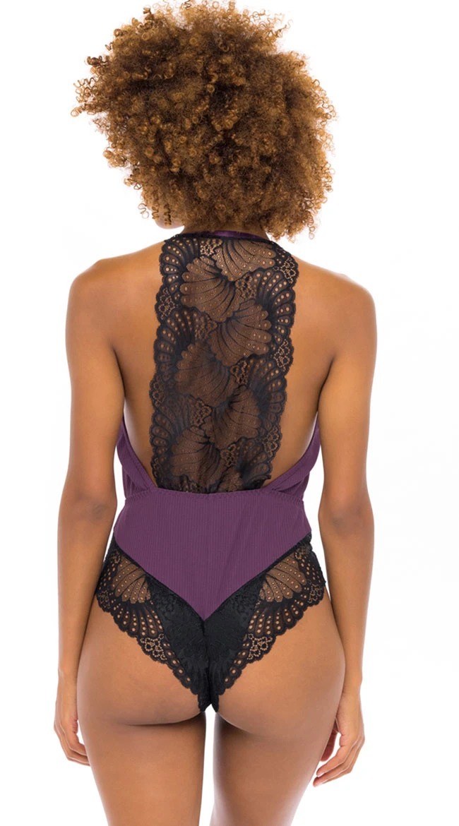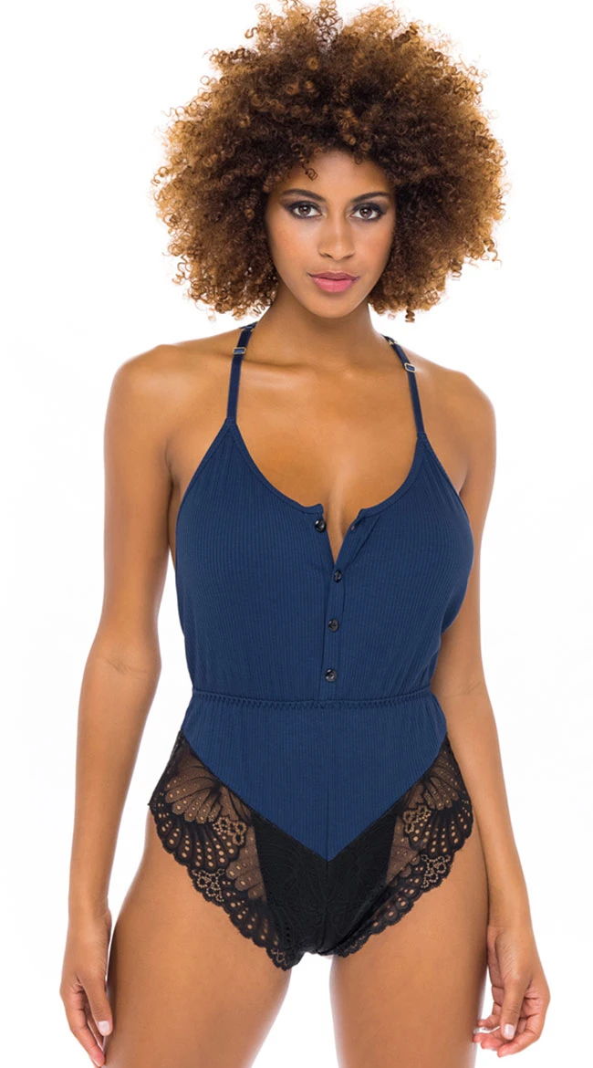 Hang out in bed with your babe in this comfy romper featuring a scoop neckline, adjustable spaghetti straps, a scalloped lace racerback, a button front ribbed knit bodice, and a cheeky cut back.