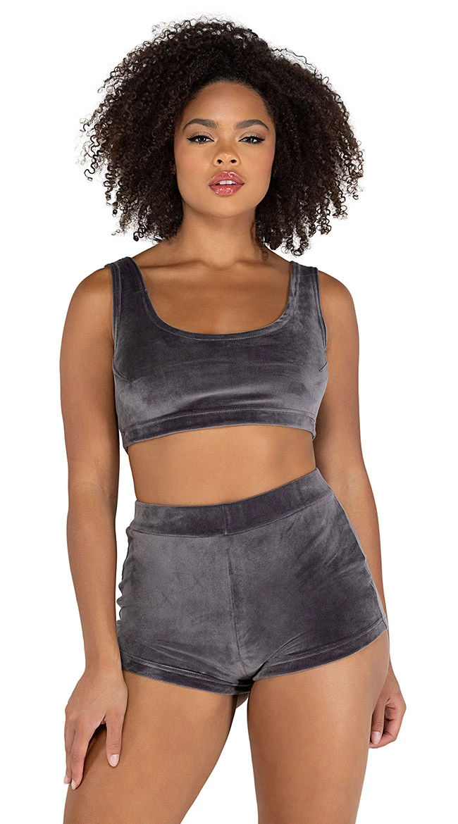 Snuggle up with your honey in this cozy velour short set featuring a cropped tank with a scoop neckline, and a matching short with an elastic waistband and a cheeky cut back. (Robe not included.)