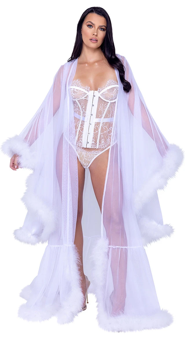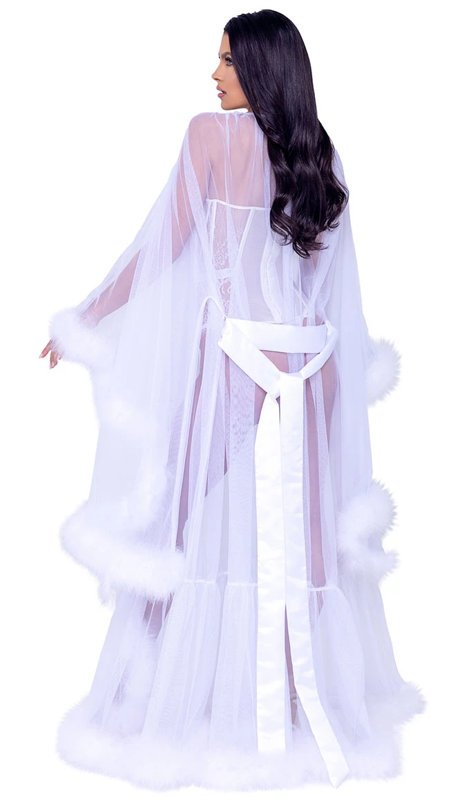 Become the mysteriously wealthy housewife you deserve to be in this gorgeous white robe featuring long draping bell sleeves with a marabou trim, a long length with a marabou trim, and a matching waist tie. (Bustier and panty not included.)