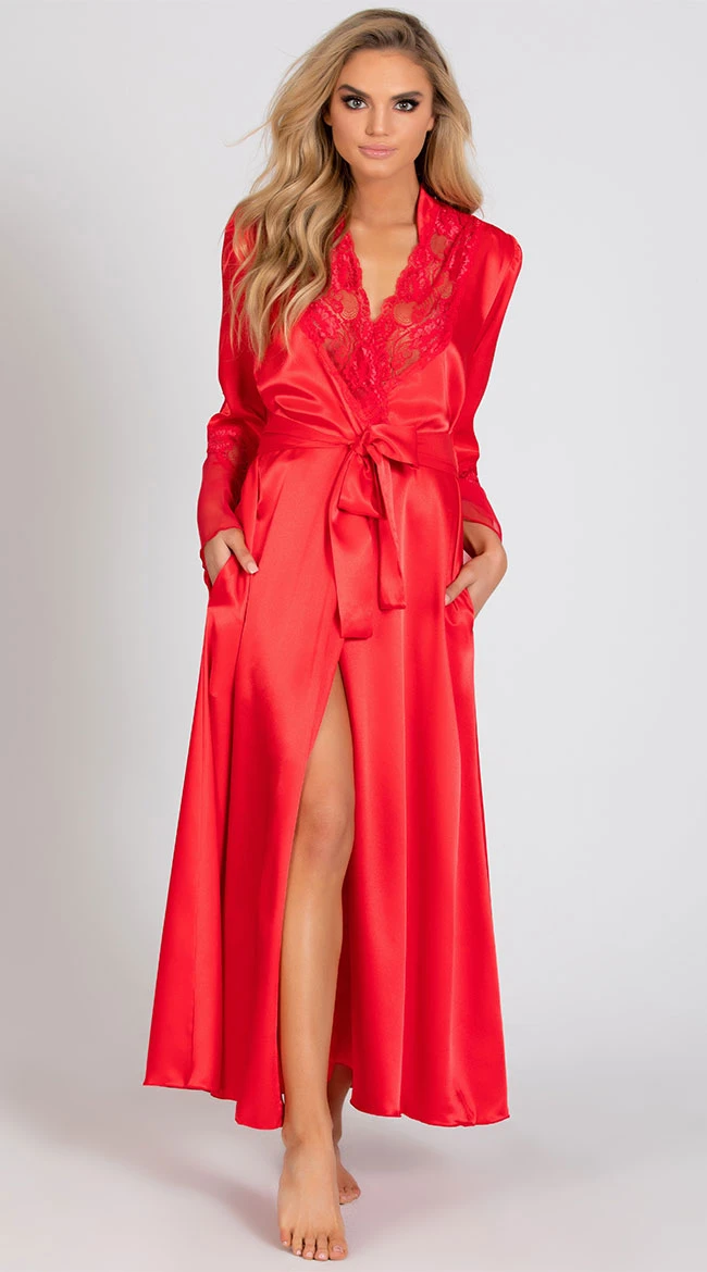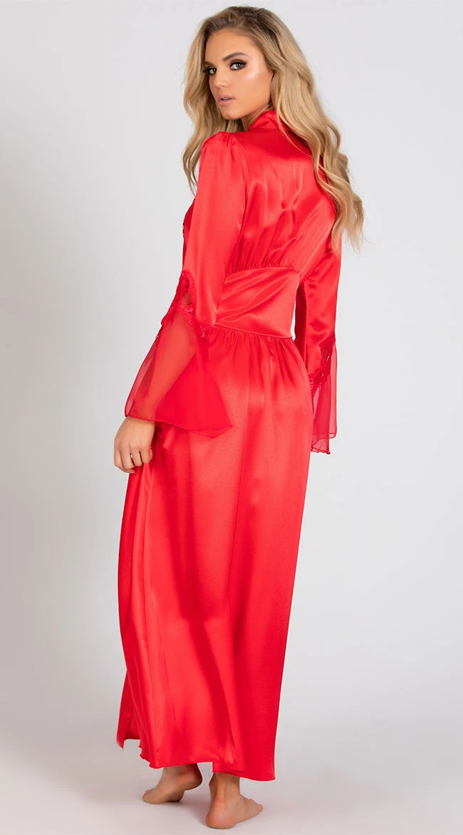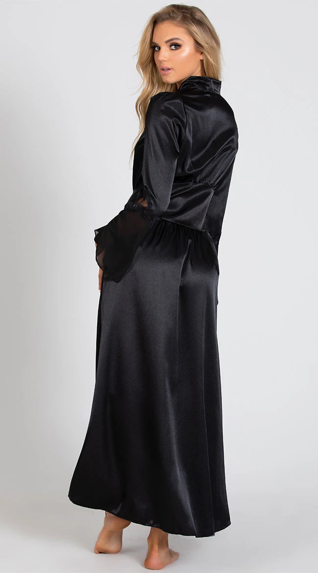 Amp up the glam factor in this long satin robe featuring long sleeves with sheer chiffon cuffs, a sheer lace neckline with a scalloped trim, and a satin waist tie. (Robe only.)